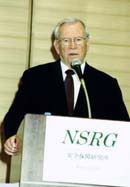 過日の平成13年11月7日開催のフォーラムは日米安全保障条約交流事業の一環とし、また締結50周年の記念行事として米国より国防長官顧問ウィリアム・シュナイダー博士ならびに元国防副長官ジョン・J・ハムレ博士を招聘して行われました。フォーラムには特別来賓として駐日米国大使
